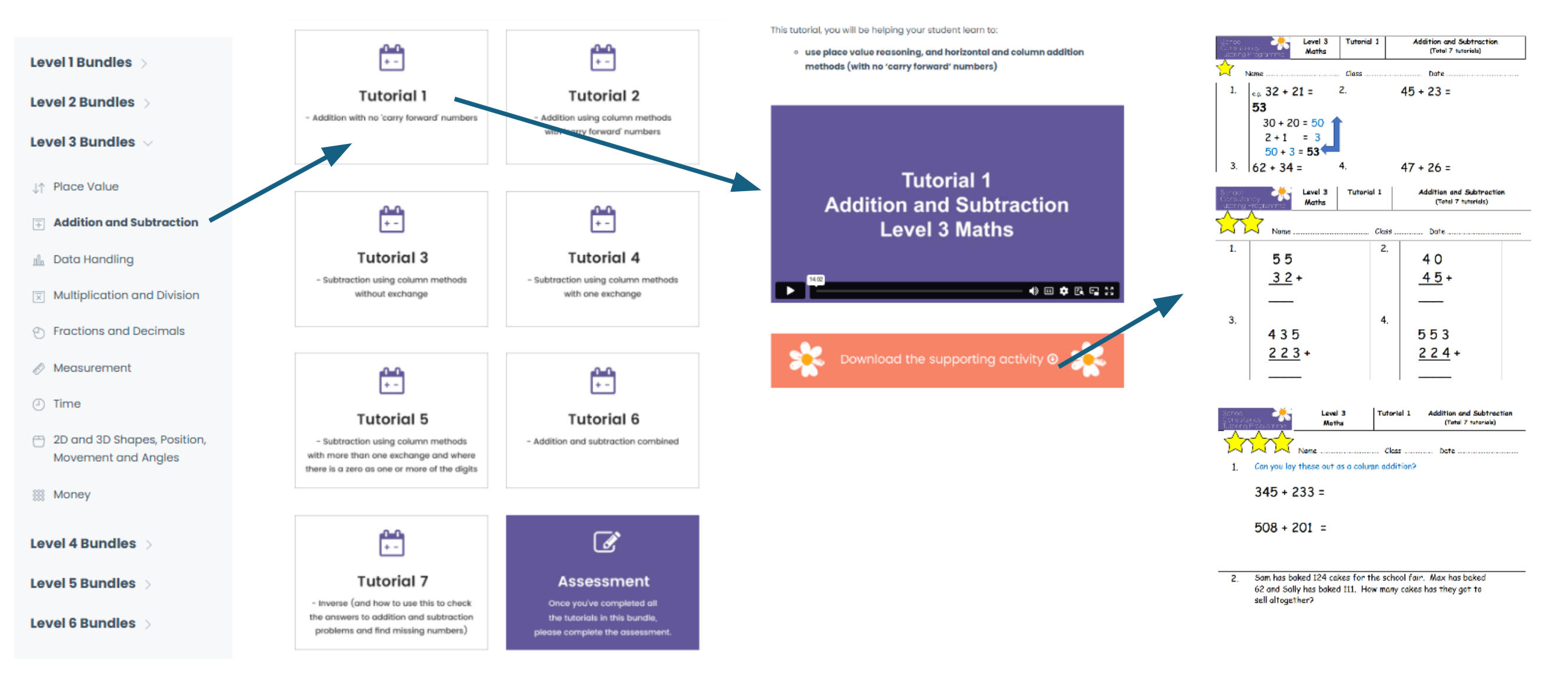 Our maths intervention programme uses a series of instructional videos and supporting 3-challenge of worksheet for each maths topic (known as Bundles) across Years 1 to 6 of the National Curriculum. Each bundle finishes with an assessment to check students’ independent understanding and progress.